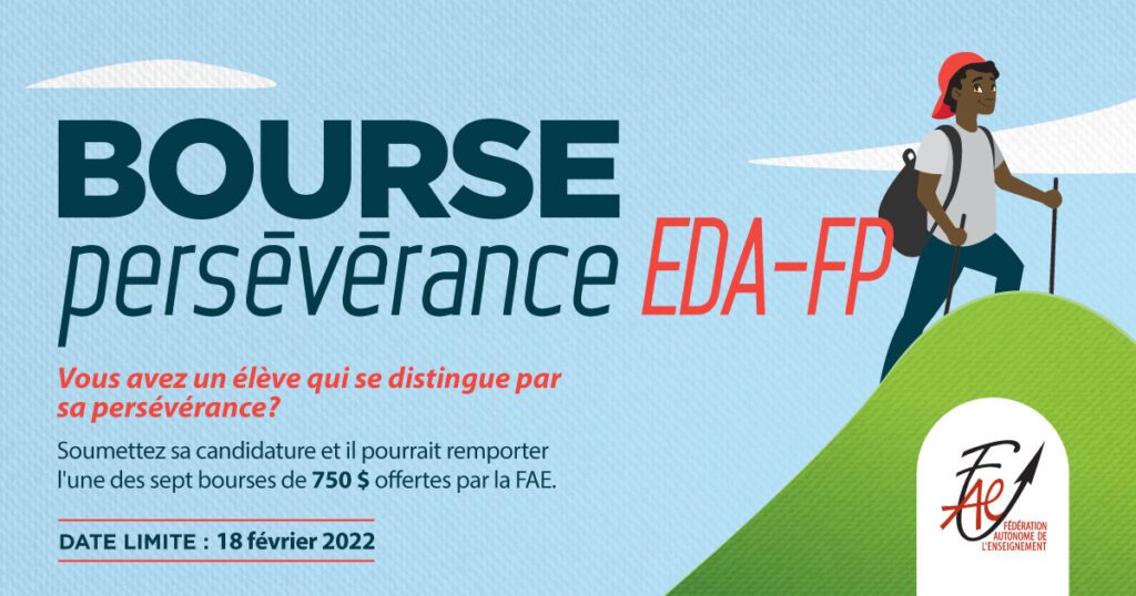 Participez au concours en nous soumettant la candidature d’une ou d’un élève se distinguant par sa persévérance avant le 18 février 2022. Le formulaire de mise en candidature se trouve sur le site de la FAE, l’adresse suivante : https://www.lafae.qc.ca/perseverance.