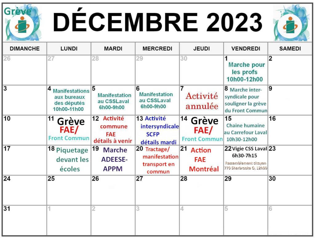 Le Syndicat de l’enseignement de la région de Laval (SERL) vous présente un calendrier des principales actions des parties syndicales impliquées dans les présentes négociations.