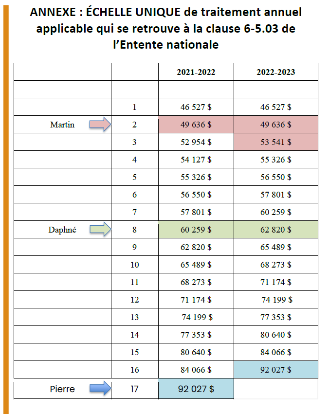 - Daphné enseigne au primaire, elle est actuellement à l’échelon 8 avec un salaire de 60 259$, dans la nouvelle échelle, elle sera à l’échelon 8 avec un salaire de 62 820$, elle sera à l’échelon 8 pour l’année scolaire 2023-2024.