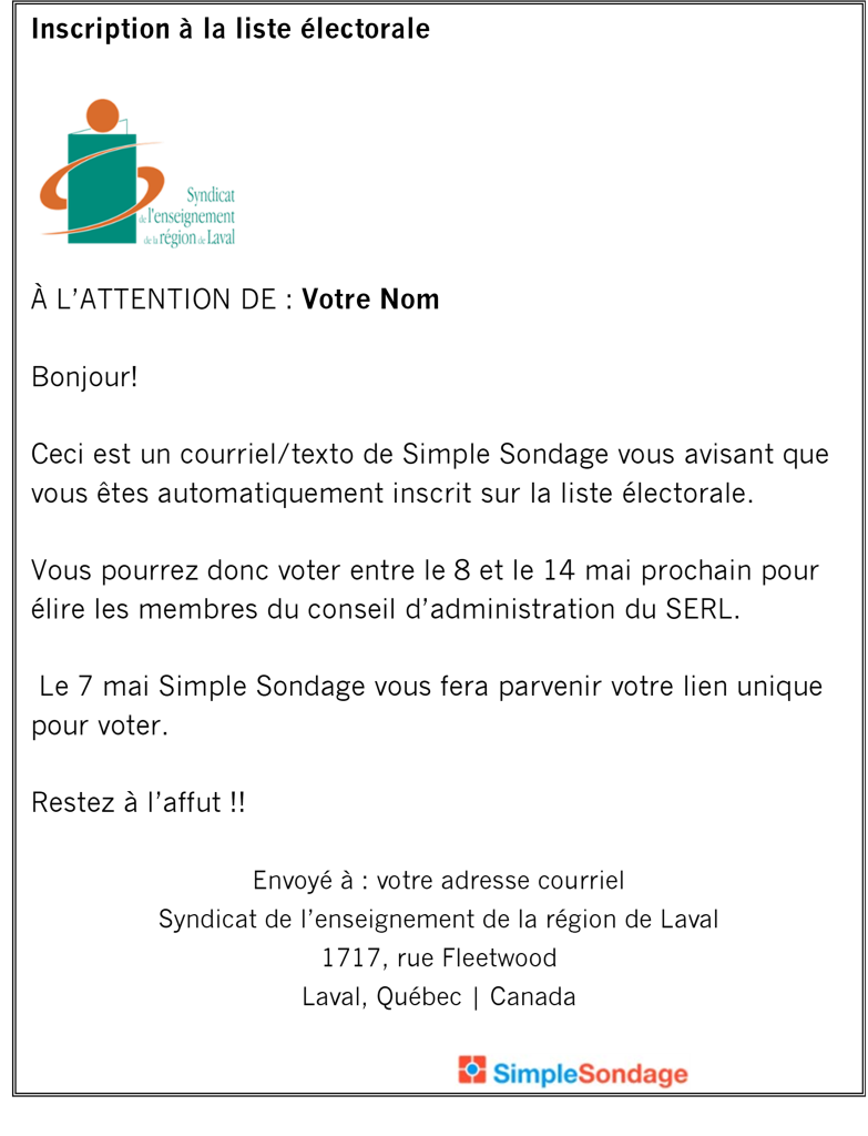 Membres du SERL, avez-vous reçu ce courriel de Simple Sondage entre le 5 et le 11 avril 2024 ? Dans l’affirmative, vous êtes bien inscrit à la liste électorale.