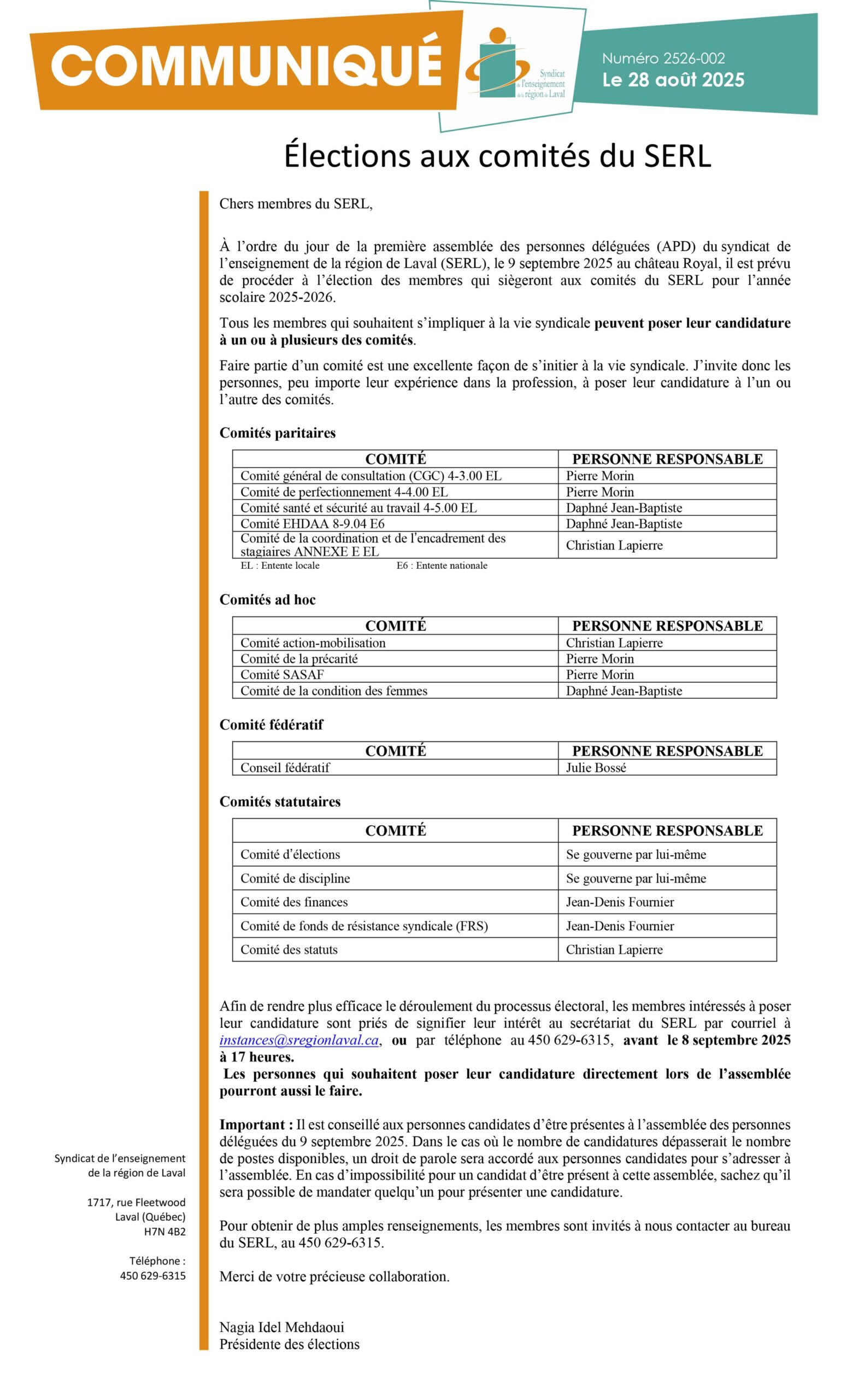 À l’ordre du jour de la première assemblée des personnes déléguées (APD) du syndicat de l’enseignement de la région de Laval (SERL), le 9 septembre 2025 au château Royal, il est prévu de procéder à l’élection des membres qui siègeront aux comités du SERL pour l’année scolaire 2025-2026.