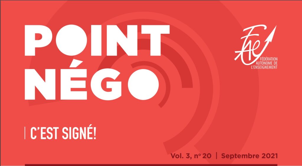 « …le 29 septembre 2021, grâce à la détermination et à la mobilisation des profs, que les représentantes et représentants de la FAE ont procédé avec fierté à la signature du nouveau contrat de travail qui couvre la période 2020-2023. »