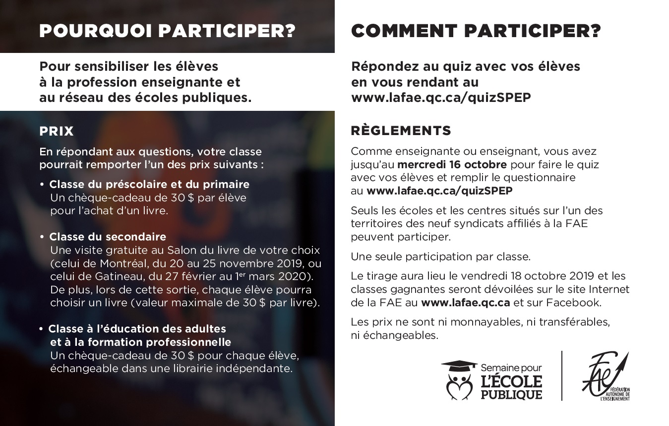 Du 5 au 12 octobre 2019 a lieu la dixième Semaine pour l’école publique (SPEP), sous le thème « Notre école publique, on l’aime! »